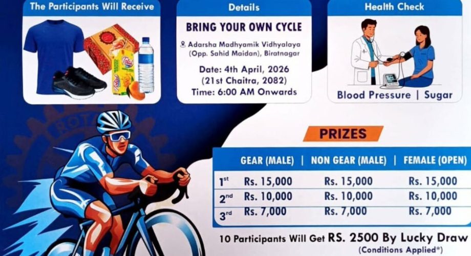 रोटरी क्लब अफ विराटनगर (फ्यूजन) ले यही चैत २१ गते शनिबार विराटनगरमा ७औं संस्करणको साइक्लोथन प्रतियोगिताको आयोजना गर्न लागेको छ ।